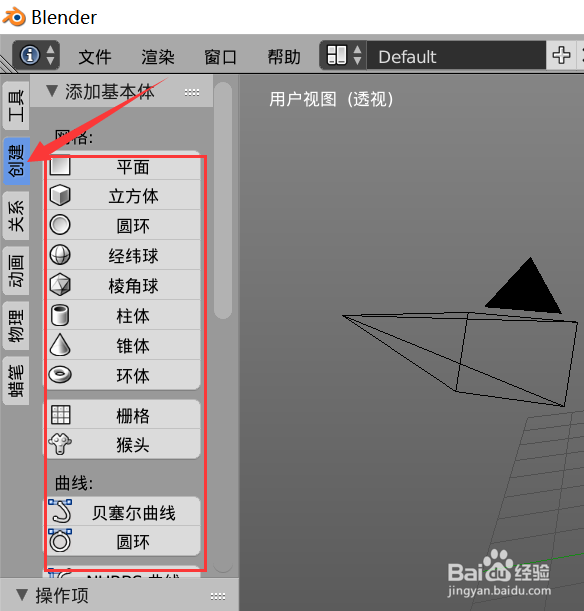 在左边的选项卡上,有创建这个分类,点击创建,然后在栏目上,有平面、立方体、圆环等,这些就是需要创建的物体了