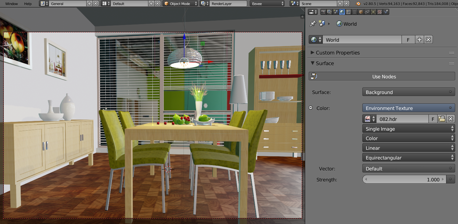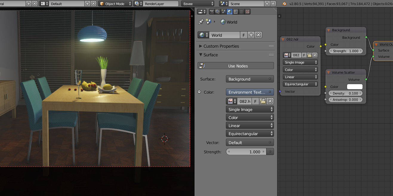 接下来我们给个HDRI照明,使整个场景亮起来,注意,这和cycles还是不一样的,毕竟都是假的,不是真光线追踪出来的