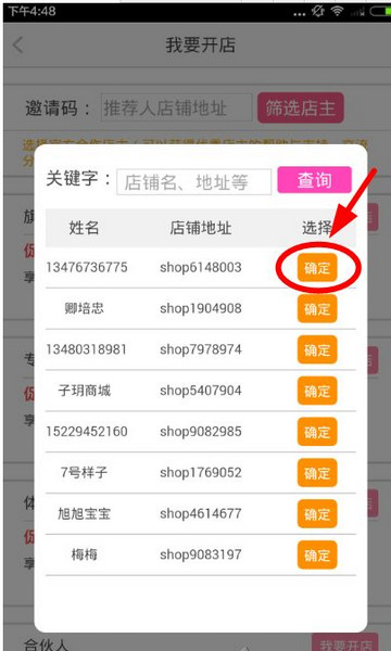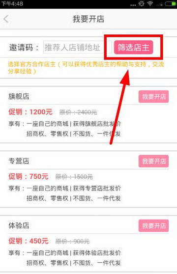 进入到我要开店的流程中,你必须要要选择一个合作的店主,选择官方合作的店主,可以获得优秀店主的帮助,分享交流经验等,如果你已经有店主的店铺ID,可以直接输入,没有推荐人的话,直接点击“筛选”按钮!不点是不能进行下一步的!