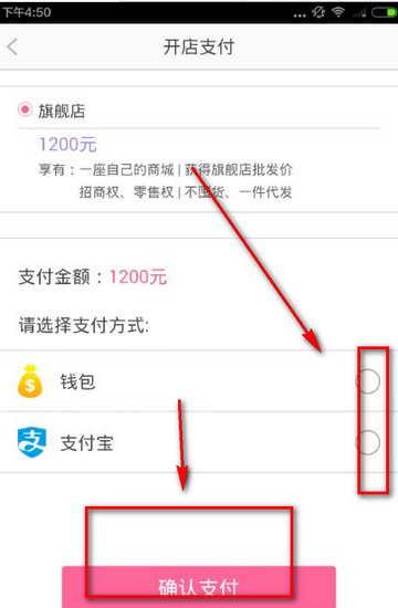 然后就需要进行支付了,比如旗舰店的支付金额是1200元,享受一座自己的商城、获得旗舰店批发价,招商权、零售权、不囤货、一件代发的特权,可以选择支付宝支付,也可以是精选速购中的钱包支付,确认支付以后就可以去大礼自己的店了!