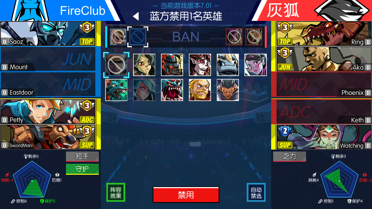 在选手阵容确定后,比赛将会进入英雄禁选环节。比赛双方根据系统顺序,各自共禁掉两个英雄,并为每个出战的选手选择一个英雄。根据选择的英雄,比赛双方会组成各自的比赛阵容,不同的阵容会按照拥有的特性值来激活相应的阵容效果。