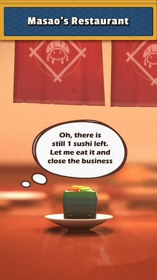 一个寿司的故事是一款好玩的模拟经营手游,无人光顾的寿司店即将倒闭,寿司却能自己销售自己,告诉老板寿司的做法,吸引顾客,不仅拯救了寿司店,还让老板成了亿万富翁!