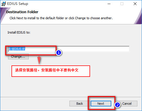 4.选择安装路径。安装路径中不要带有中文,例如小编安装在E盘,安装路径为“E:\EDIUS 8\”.然后点击“Next”继续安装。