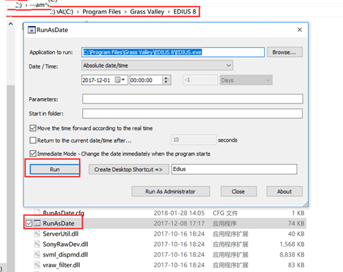 11.如果运行出现错误,运行安装目录C:\Program Files\Grass Valley\EDIUS 8里面的RunAsDate.exe,点run就可以了