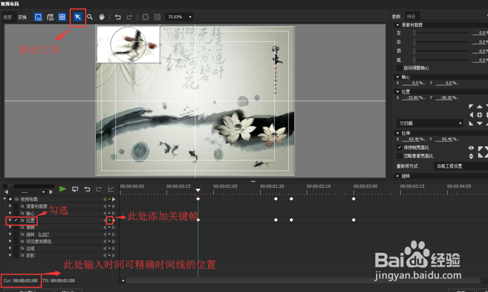 接下来我们在页面底端的时间轴处设置图片的运动轨道。(1)我们把时间线拖到一秒处,如果担心拖的不准确,我们可以在当前时间处输入1秒即可。(2)点击视频布局窗口处的移动工具,把图片移到最左端(3)在时间轴菜单处勾选上位置并且点击添加或删除关键帧,2秒3秒处同理。图片在中间停顿0.5秒的处理是把时间线拉倒2.5秒处,图片依旧在中间处不变,点击添加关键帧即可。具体操作如下图: