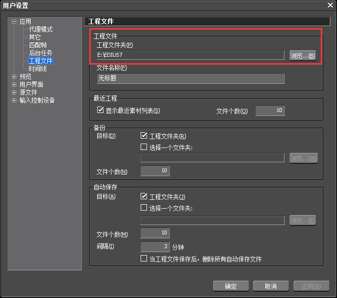 2、在弹出的“用户设置”对话框中,选择“应用”选项中的“工程文件”子选项,在对话框右侧,可以更改EDIUS工程文件的默认文件夹位置。