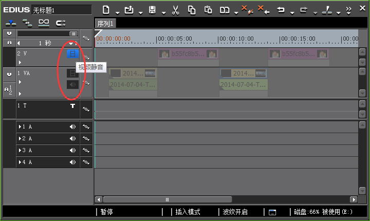 此外,还有一种“伪禁止”状态,就是视音频虽然呈灰色状态,但却是可编辑的。仔细观察是可以发现区别的,这种情况是将视音频静音给点开了,只要再点击一次“视音频静音”即可使素材重现色彩。