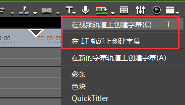 首先,将时间线指针拖到要插入字幕的位置,点击时间线面板工具栏上的 T 字图标,根据需要选择“在视频轨道上创建字幕”或“在1T轨道上创建字幕”。两种不同的创建字幕的方式,所产生的结果也不相同,根据编辑视频的需要,可以选择合适的插入字幕方式(如切换片段中间的字幕,需要使用“在视频轨道上创建字幕”)。
