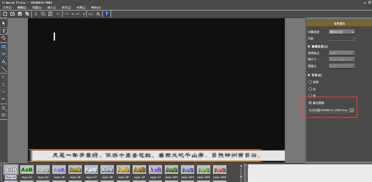 本文小编就以“在视频轨道上创建字幕”为例,在弹出的Quick Title窗口中输入EDIUS添加字幕所需文字,最下方可选择字幕风格,右侧可更改字幕文本属性,最简单的情况就是调整字幕位置,更改字体、大小等,然后点击左上的“保存”图标;
