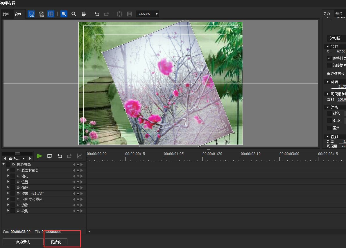 首先导入素材到素材库,然后双击信息窗口里的视频布局进入视频编辑页面,如下图所示: