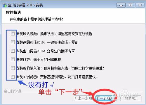 5、此时电脑自动安装,会出现很多打勾的安装界面,全部取消打勾后单击“下一步”。
