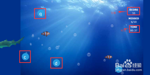 3、进入“玩泡泡”游戏界面时,右上边有三个单词,分别是SCORE:分数,就是游戏当中所获得的分数,MISSED(错过):在游戏当中,从下往上会漂移圆圈,圆圈上有字母,游戏者需要敲击圆圈对应键盘上的字母,正确了,圆圈就会消失,同时分数会增加,如果没有敲击正确,圆圈就会飘出屏幕外,MISSED就会+1,MISSED等于10时,游戏结束,而且随着游戏时间的增加,圆圈也会增多,难度加大。