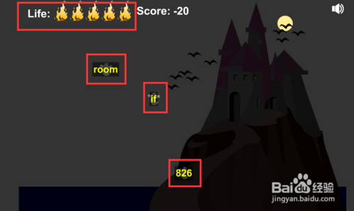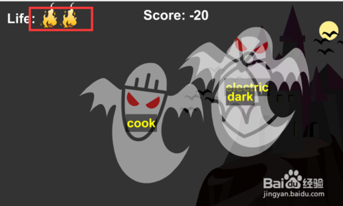 5、进入游戏界面之后,界面的左上方有一个词语LIFE(生命),游戏中一共有5点生命值,游戏主界面同时会出现3个幽灵,幽灵上面有字母或者数字,游戏者在键盘上找到相应的字母或数字,进行点击,点击正确之后,幽灵就会消失。