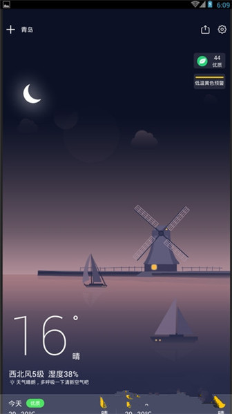 空气质量:各地区PM2.5精 准监测,天气预报监测站尽在掌握。逐时预报:实时掌握24小时天气变化,当天温差提前预防。