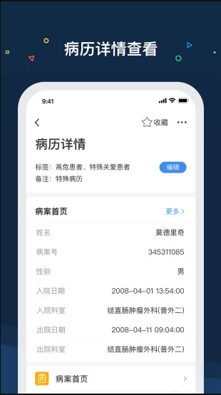 3、医生可在医渡云app上管理个人名下的相关的患者,同时也可以对关注的病历,进行在线收藏;
