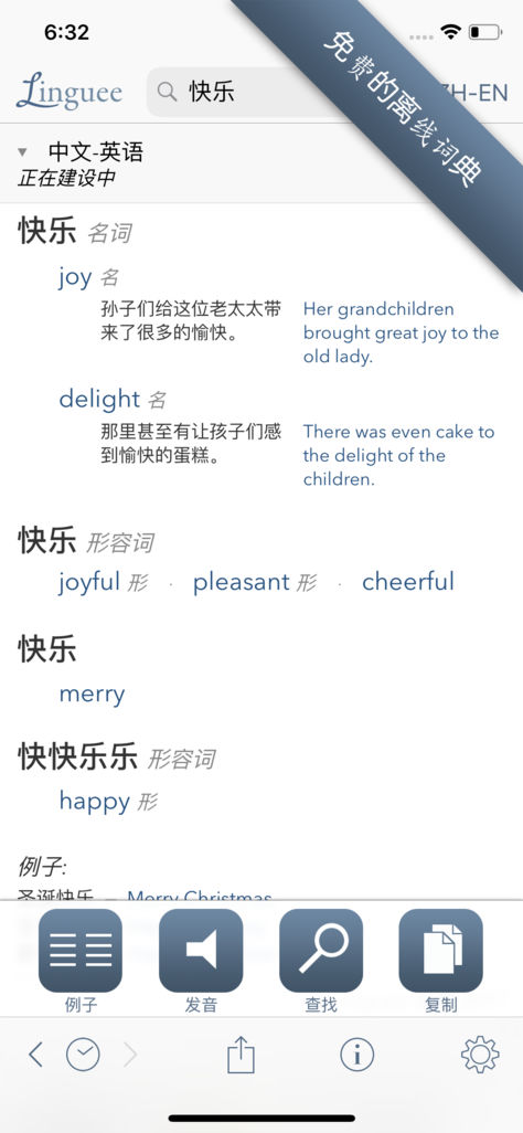 又快又省学语言:Linguee 提供免费辞典下载,即使不联网也可以使用,每个单词有详细的意思解释和例句,还有美英两种发音供语言学习者参考。点击屏幕的左下角,还能看到你在 Linguee 的查词历史记录,作为复习资料使用非常方便。