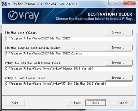 4、出现安装路径时,注意路径要与安装max的路径一致,其实大多时候程序会自动读取max安装路径,不需改动,但是也要注意,万一读取错误时要手动更改。