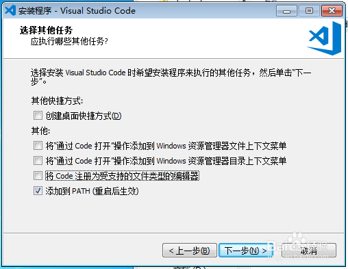然后下图中是选择在进行软件安装的时候要进行其他的任务,这里小编只是选择【添加到PATH(重启生效)】这个选项,然后继续点击下一步,如下图: