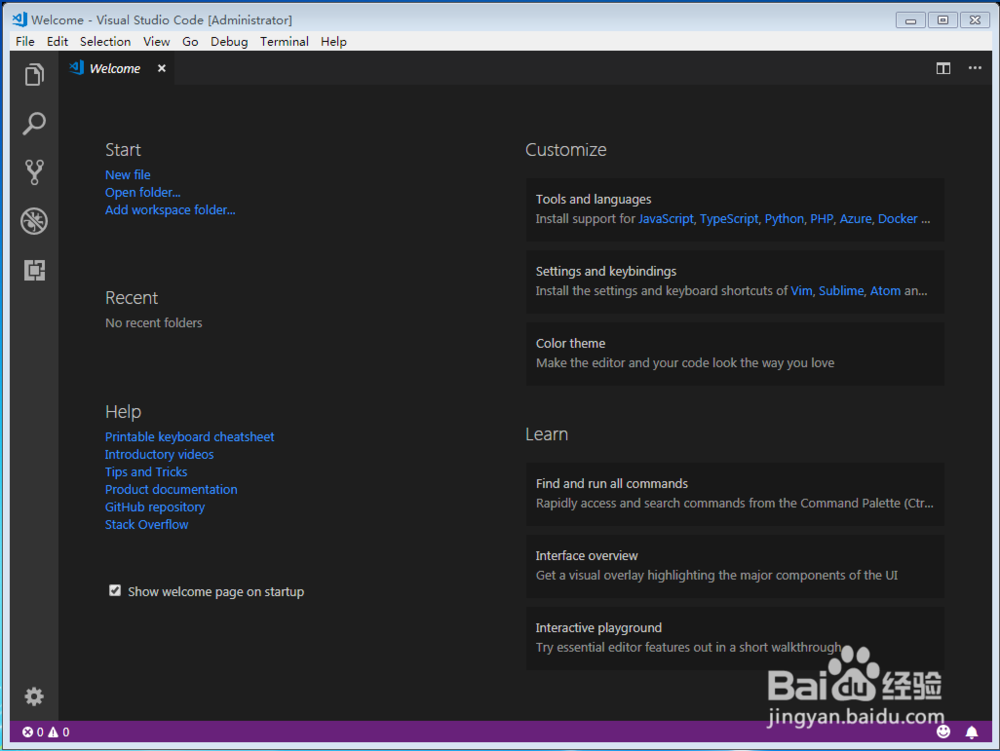 安装结束之后会默认打开VSCode,打开的VSCode软件界面如下图所示: