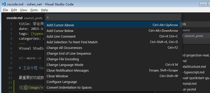 vscode快捷键最重要的功能就是 F1 或 Ctrl+Shift+P 打开的命令面板了,在这个命令框里可以执行VSCode的任何一条命令,可以查看每条命令对应的快捷键,甚至可以关闭这个编辑器。