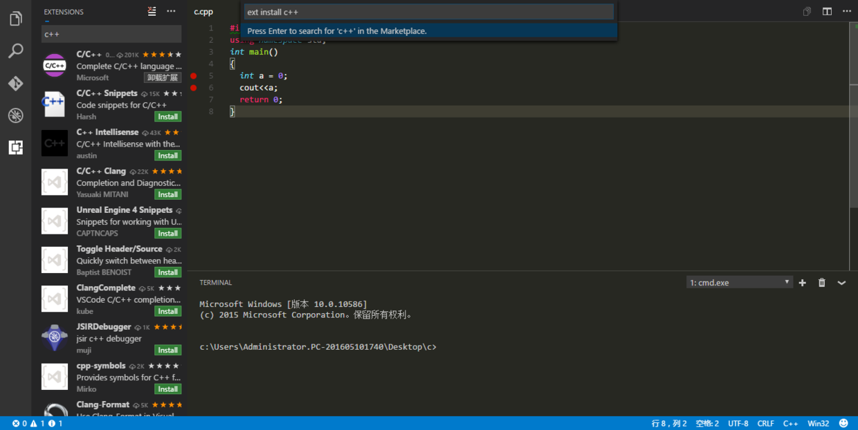 点击第一个开始安装或升级,或者也可以 Ctrl+P 输入 ext install进入
