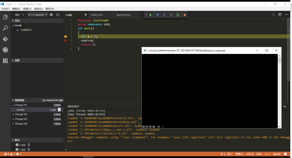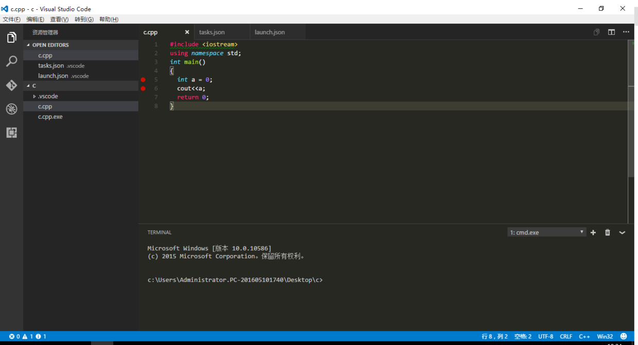 替换后保存,然后切换至a.cpp,按F5进行调试,此时会弹出一个信息框要求你配置任务运行程序,点击它~