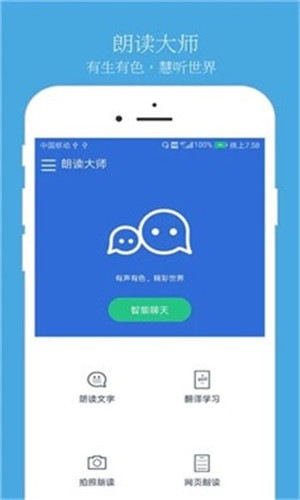 智能聊天:语音聊天,丰富生活。朗读文字:普通话方言,应有尽有。