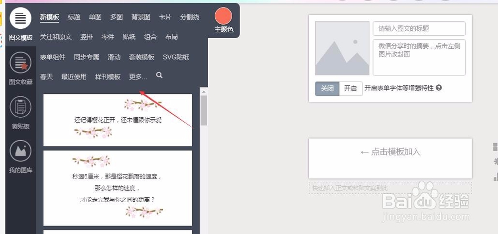 编辑排版的时候,鼠标停留在页面编辑区当前正文里的某个位置,从左边工具栏点击添加模板会添加在页面编辑区鼠标的位置之后;如果页面当前没有选中某模板,点击添加模板就添加在页面编辑区的末尾。