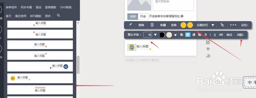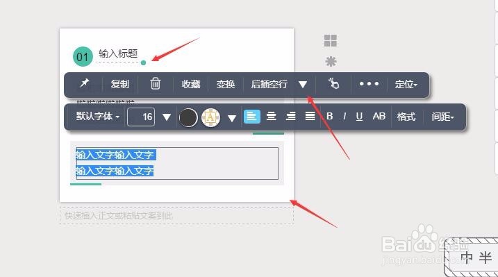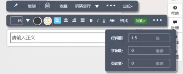 以标题系统模板的正文输入模板为例,向编辑区添加“请输入正文”模板,在编辑区点击该模板选中,就会出现对应的工具箱。