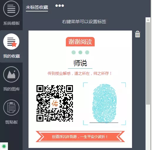 选中做好编辑的一个或多个模板,会出现模板的工具箱,尤其是选中多个模板的时候,工具箱只有三个工具:复制、删除和收藏,选择收藏,即可把选中的所有模板及其排版内容原封不动地收藏到“我的收藏”文件夹里了。