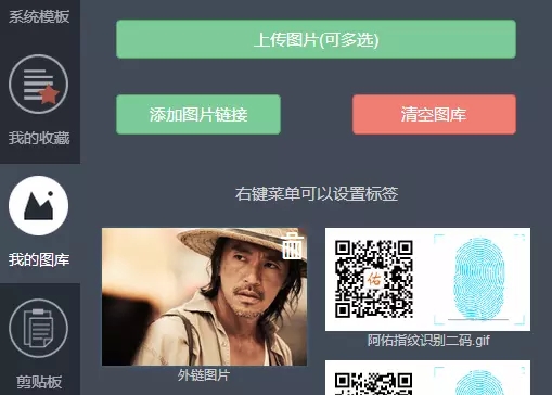 “我的图库”是收藏图片的地方,可以通过上传本地图片获取图片,也可以通过添加图片链接获取图片。