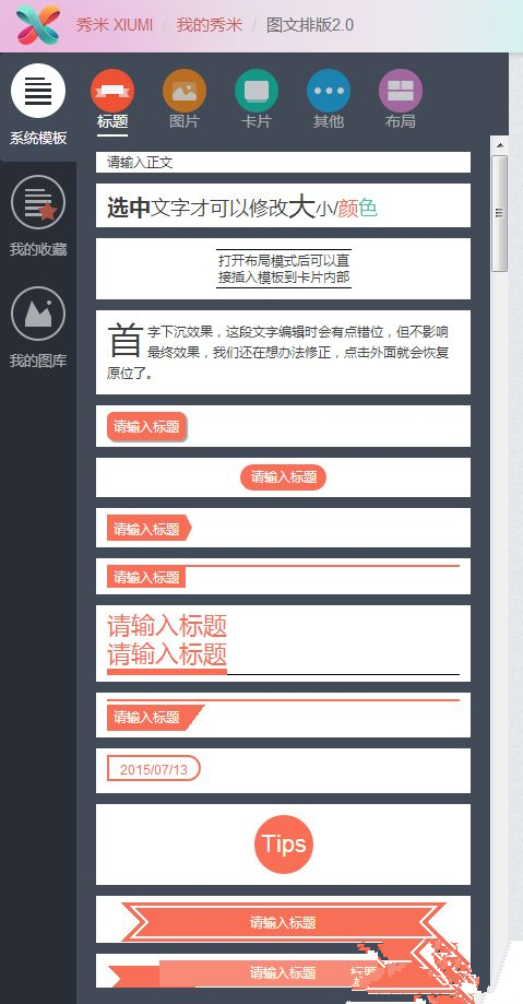 在秀米的编辑器中,有标题、图片、卡片等等排版的模板,我们可以根据文章的内容形式在选择不同的模板类型