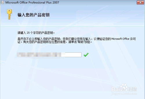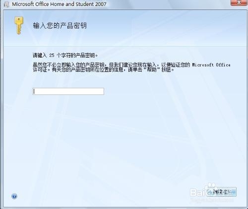 打开office2007安装程序,会出现界面让你输入“安装密钥”,在其中输入PGHBF-6K7PC-J9989-BGGJD-TKT3Q这个密钥进行安装。