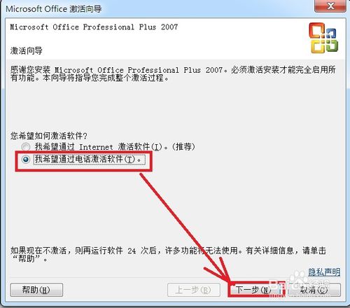 运行office2007软件,在弹出激活界面选择“我希望通过电话激活软件”,并单击“下一步”。