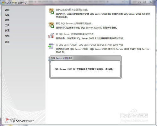 4、“安装程序正在处理当前操作,请稍后”等一会,下面安装过程中很多次都弹出sql server安装中心主界面可以不用管