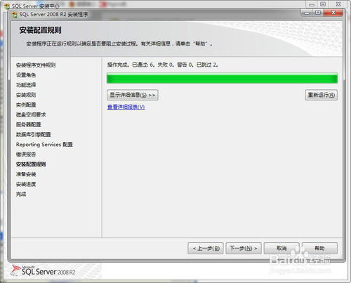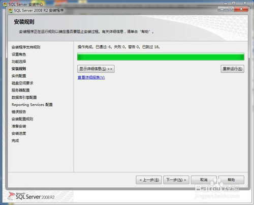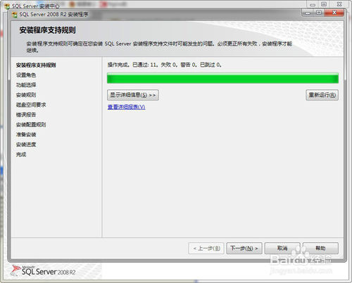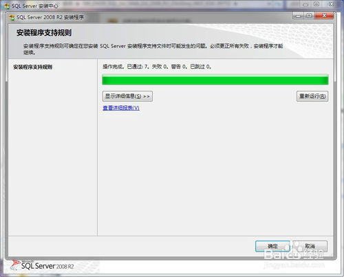 5、然后会弹出一个会话框“安装程序支持规则”,检查正常,点击确定