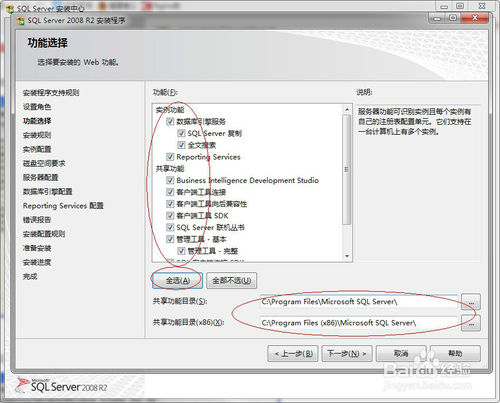 11、功能选择:点击全选按钮,(共享功能目录看个人意愿是否需要修改到其他盘)并点击下一步