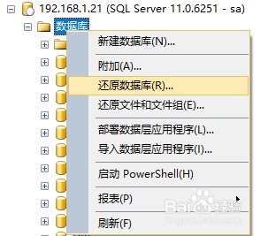 2、在“数据库”上右键“还原数据库”。