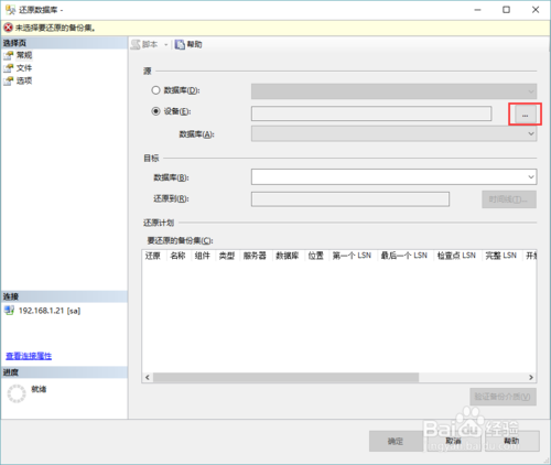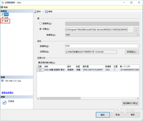 5、再次检查目标数据库,及备份集信息无误,点击“选项”进入选项卡