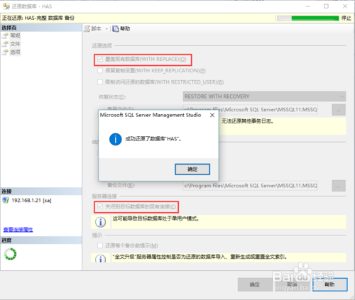 6、勾选“覆盖现有数据库”及“关闭现有连接”复选框,然后确定,直至还原成功