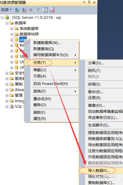 1、在对象资源管理器中,选择需要导入的数据库,然后在数据库上右击,找到右击菜单中的任务,然后在任务下选择导入数据,如下图。