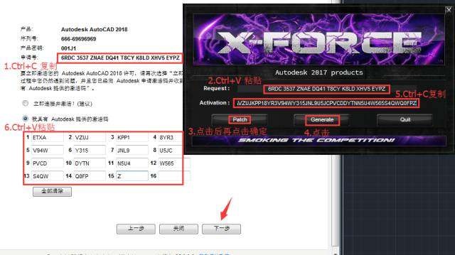 14.把申请号复制到注册机里面的Request,先点击Patch,再点击Generate后复制激活码,然后粘贴激活码,最后点击下一步即可。