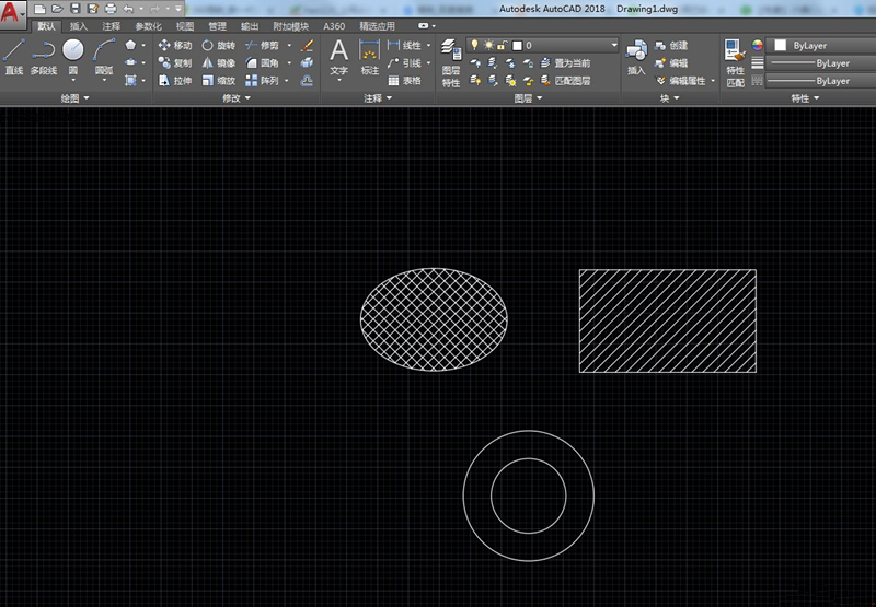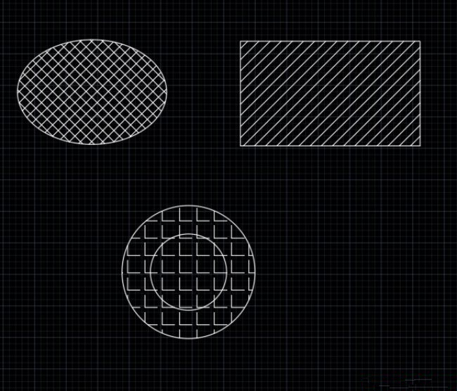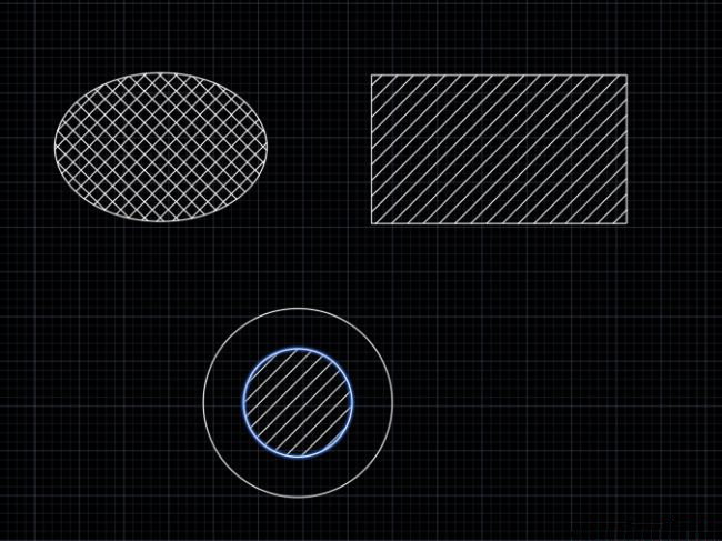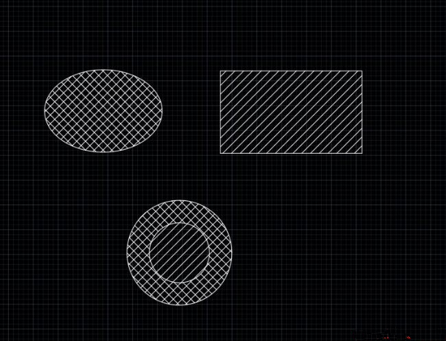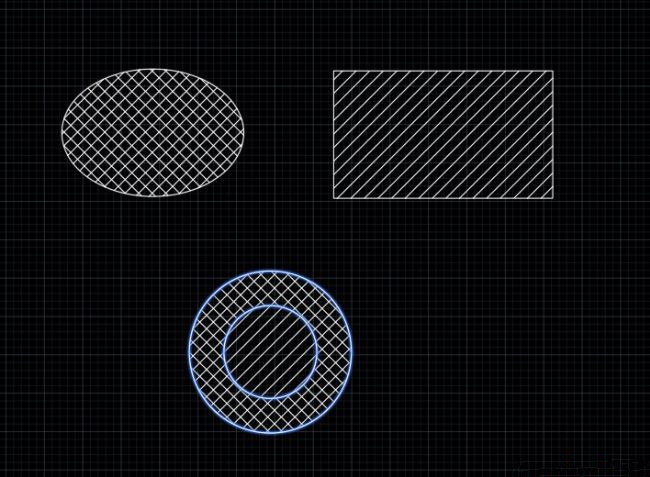 例如:图中现有网格线图案和斜线图案,现要为环形内圆填充斜线图案、环形填充网格线,可以用快捷键“h”回车,点选环形和圆形,随便填充一个图案,然后用快捷键“ma"并回车,按提示获取斜线的特性,然后刷下圆中网格线。再用快捷键“ma"并回车,按提示获取网格线的特性,然后刷下环中图案。