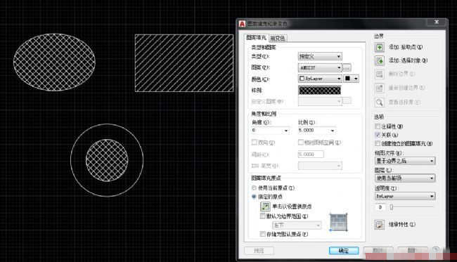 例如:图中现有网格线图案和斜线图案,现要为环形内圆填充斜线图案、环形填充网格线,可以用快捷键“h”回车,按提示输入"t"并回车,调出“图案和填充渐变色”设置对话框,选择“继承特性”,按提示获取斜线的特性,然后对圆中网格线填充。同样选择“继承特性”,按提示获取网格线的特性,然后对环中网格线填充。