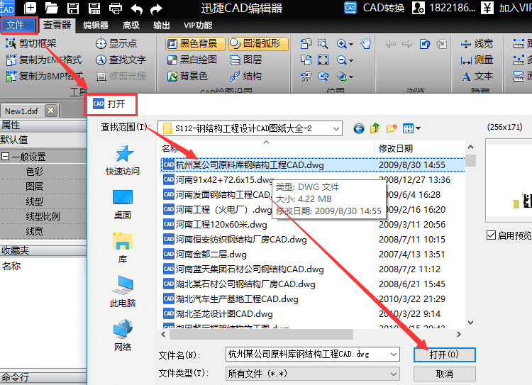 第二步:进入到迅捷CAD编辑器的操作窗口之后,点击软件顶部最左侧菜单栏中的“文件”选项卡,在其下拉栏中在点击“打开”按钮,在弹出的界面中选择并打开需要进行编辑的CAD图纸文件。