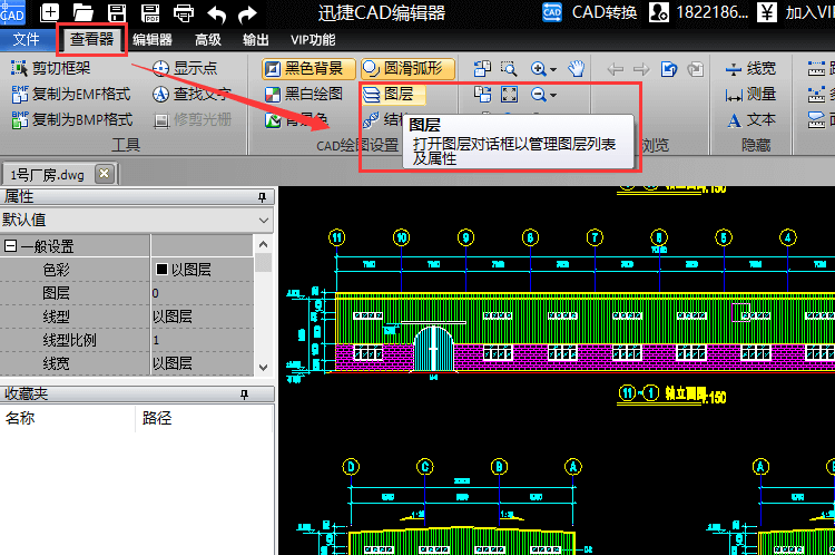 第三步:打开CAD图纸文件之后,需要把编辑器上方的菜单栏切换到“编辑器”选项卡,在“CAD绘图设置”中点击“图层(打开图层对话框以管理图层列表及属性)”按钮来打开图层对话框。