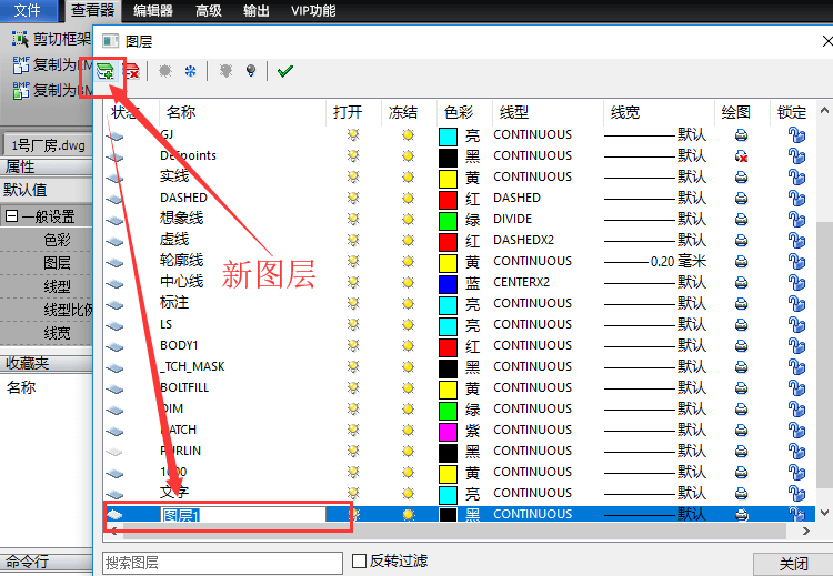 第四步:打开图层对话框之后,点击对话框左上方的“新图层”按钮之后就可以新建一个图层,然后在新图层中输入图层的名称,还可以在色彩、线型、线宽等选项卡中对新建的图层进行设置。