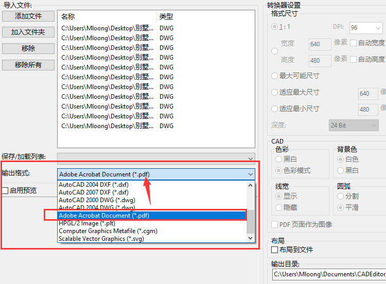第四步:接着在批处理界面中点击“输出格式”选项,将需要输出的CAD图纸文件格式更改为PDF格式的文件。