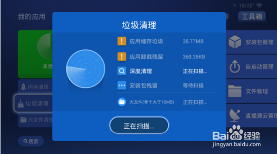 垃圾清理盒子里的应用长时间运行也会产生垃圾文件,若不及时清理,也会影响电视的运行速度。所以也尽量不定期清理一下。
