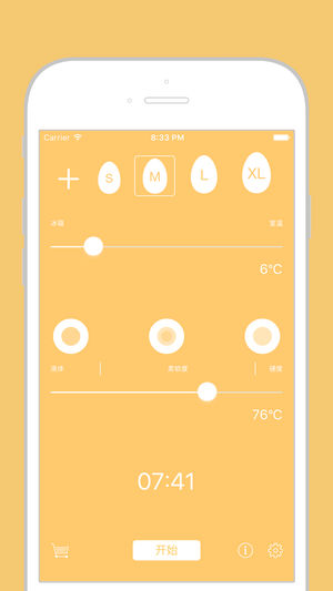 煮蛋定时器app操作界面比较简单,由上至下分别考虑到蛋的大小、蛋的温度和蛋黄的固化程度,以及需要煮的时间。蛋的大小